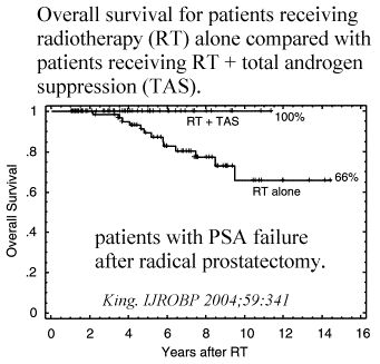 radiation after the PSA starts rising go here. recent studies still suggest that immediate radiation (after surgery if the path shows + margins or is T3) will improve the cure rate (i.e. bNED meaning the PSA will remain low) but not improve the overall survival (see study below)