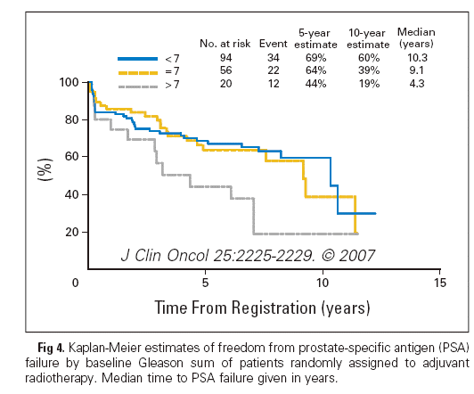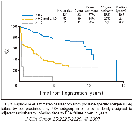 Postoperative radiation (i.e. radiation given to the tumor bed, or the area where the prostate was removed from with a radical prostatectomy) is generally recommended if the pathology report shows that the tumor has spread through the capsule, into the seminal vesicles or has + surgical margins (T3 cancer). Radiation given immediately after recovering from surgery (which may take 6 weeks to 3 months) is called adjuvant or postoperative therapy, and there are three large studies showing the benefit of post operative radiation (go here). Collected data say the best results are when the PSA is the lowest and for every PSA rise of 0.1 the cure rate falls by 4% (go here) and here.