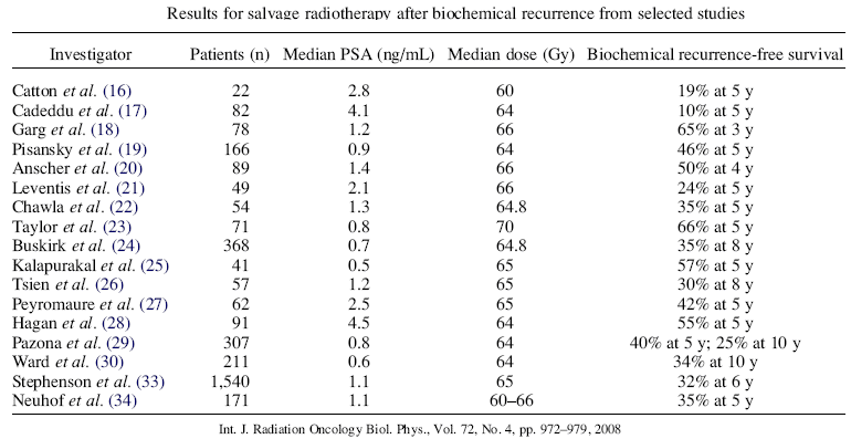 After having a radical prostatectomy the PSA level should fall to 0. Any persistent elevation is worrisome and any consistent rise in the PSA is considered evidence of a relapse. If the rise in the PSA is slow and occurs after a prolonged period, the site of relapse is generally at the site of the original tumor, and radiation to this area may still cure the patient. (see recent study in JAMA here and here and other recent studies, another study, a study of postop 3D conformal radiation.). There is evidence that salvage radiation increases survival (go here). There is evidence that a higher dose is better (Stanford study recommends 70Gy go here).