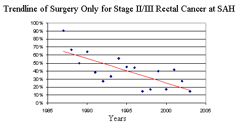 There were 1,882 cancers and the numbers have been stable over the years of the study. There were 1,358 colon cancers with a male: female ratio of 44:56 (NCDB was 49:51.) There were 526 rectum/rectosigmoid cases with a gender ratio of M:F 48:52 (NCDB 57:43). The race distribution was 93% white and 7% black (NCDB was 83% and 11%.) The SAH patients were slightly older with a median age of 76 (versus 72y national) and as in figure 1. Stage distribution and comparisons are shown in figures 2 and 3 and survival comparisons in figures 4 and 5. The relative 5-year survival for all cases of colorectal cancer was 65%, which compares well with national survival data reported form SEER (62%). Using observed survival (which doe not correct for death from other causes) the survival at SAH is slightly lower than NCDB (44%/5 years compared that for NCDB colon 47.5% and rectum 50.6%) which would be expected since the patient population is older. The overall stage distribution and survival by stage compare favorably with national data. Current treatment guidelines advise the use of adjuvant chemotherapy for patients with stage III colon cancer. In 2002 the NCDB reported that 45% of stage III colon cases were treated with surgery only versus 57% in the SAH data.. We compared the outcome and age of patients who did and did not receive adjuvant therapy, and as noted, those who did not were older and had a shorter survival. For stage II/III rectal cancer the NCDB report that 22% of the patients in 2002 were treated with surgery only at SAH over the whole study period the number was higher (47%). The patient who did not receive adjuvant were older (77y versus 66.6y) but paradoxically had a better survival (68% versus 62%.) We looked at all stage II/III rectal cancer by year and found a declingin incidence (downward trend) in patients who did not receive adjuvant therapy (figure 6.) The NCCN (National Comprehensive Cancer Network) guidelines recommend that all stage II/III rectal cancer and stage III colon cancer patients receive adjuvant therapy. Summary: The stage distribution and survival of colorectal cancer at SAH compare favorably with national benchmark standards. This cancer has been shown to benefit from staging (colonoscopy) and efforts to increase public awareness if a goal of the committee and the results should be reflected in stage shifting to the earlier stages. The NCCN guidelines are becoming the standard of care for cancer in the US and it has been a goal of the cancer committee to promoted used of these guidelines and is regularly included ion the tumor board presentations. |