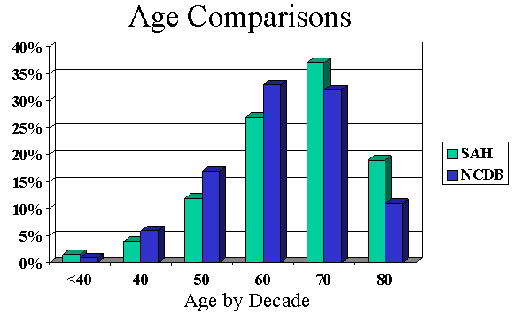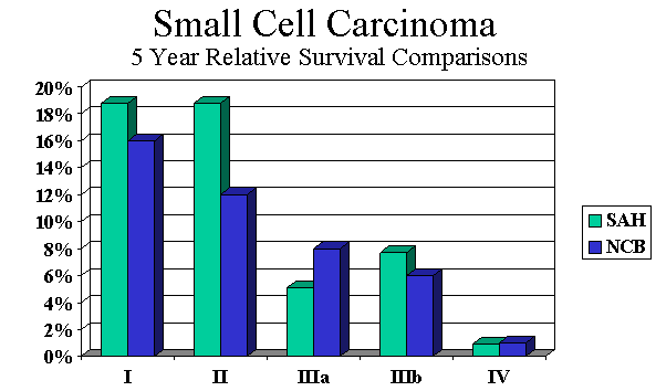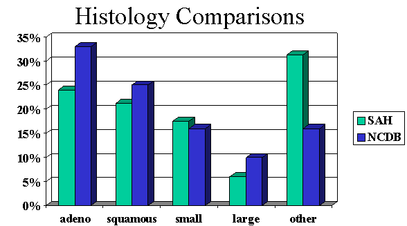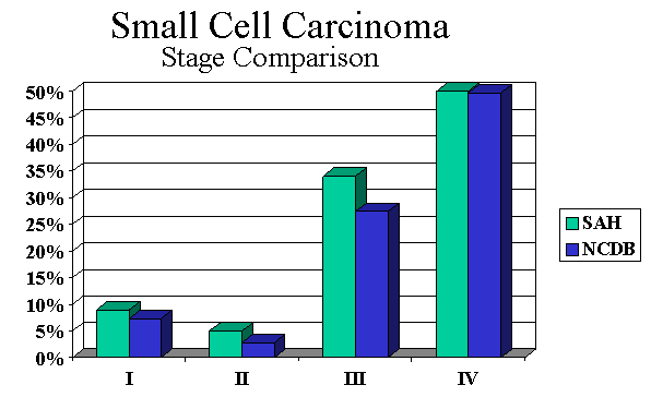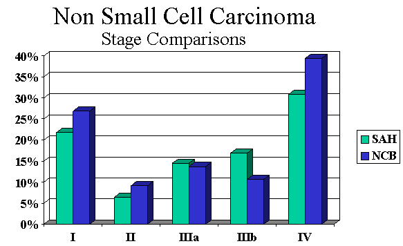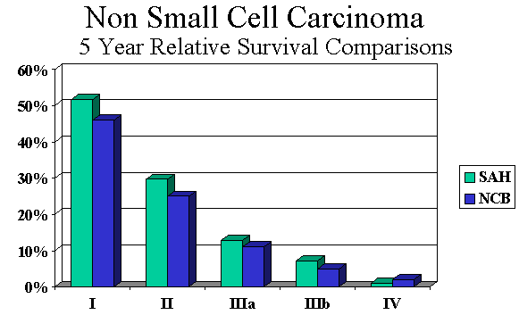 Non-small cell carcinoma comprises the majority of cases and also presents in advanced stages (Figure 5). There were 1,401 cases. Median age of 71 and more men than women (54% male and 46% female). Stage and survival comparisons are favorable with national data (Figures 5 and 6). |