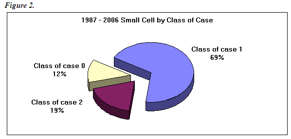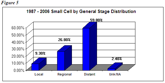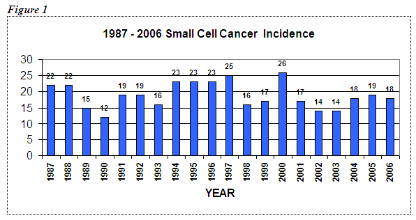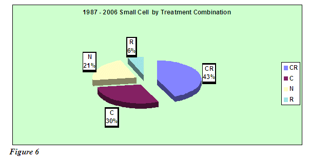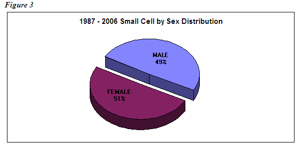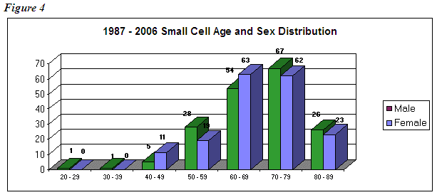 The Cancer Committee decided to review Small Cell Lung Cancer from 1987 – 2006, for age, sex, staging, treatment distribution, and survival information. A total of 378 analytic cases were identified for data analysis. The numbers have been stable over the years. |