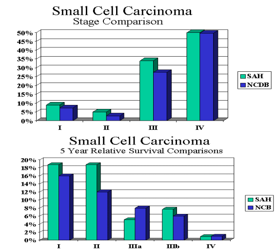 With modern chemo/radiation, survival in limited stage disease is 12-18 months median and for advanced stage, 6-9 months. Our data are comparable with national data.