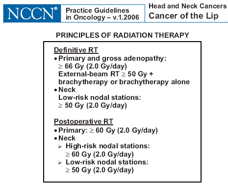 Carcinoma of the lip and selected sites of head and neck skin. A clinical study of 896 patients.Petrovich Z,Radiother Oncol 1987 Jan;8(1):11-17. Basal cell carcinoma (BCC) was found in 467 (52%) patients, squamous cell carcinoma (SCC) in 362 (40%), and the remaining 67 (8%) had tumors with mixed basal and squamous cell features. This study has again demonstrated the effectiveness of radiotherapy in controlling small and intermediate size epithelial tumors of the skin and lip. Additionally, irradiation, if administered properly, results in excellent cosmesis and a low incidence of treatment complications. Cancer of the lip.Fitzpatrick PJ J Otolaryngol 1984 Feb;13(1):32-6 A retrospective review of 361 patients with carcinoma of the lip seen between 1971 and 1976 was performed. There were 348 squamous cell and 13 basal cell carcinomas. The lower to upper lip ratio was 15:1 and the male to female ratio 12:1. The median ages for men and women were 64 and 71 years. The tumors were not staged but four had regional metastases when diagnosed. The primary tumor was controlled by surgery in 76/85 (89%) patients, by surgery and radiation combined in 65/70 (93%) patients, and by radiation alone in 193/206 (94%) patients. Altogether 24 (6.5%) patients developed cervical node metastases and these were controlled in 20 (83%). Tumor related deaths occurred in 11 (3%) patients and the five year cause specific survival rate was 97%. Radiotherapy for cancer of the lip. A long-term evaluation of 85 treated cases.Gooris Oral Surg Oral Med Oral Pathol Oral Radiol Endod 1998 Sep;86(3):325-30 The results of radiation therapy, both as a single treatment modality and after radical surgery for squamous cell carcinoma of the vermilion surface/border of the lip, are retrospectively analyzed in 85 patients. All recurrences (7%) occurred in T2 and T3 tumors treated with external beam radiotherapy only. The long-term esthetic result and functional morbidity are evaluated. Referral patterns are discussed, and the need for a multidisciplinary treatment protocol is emphasized. |