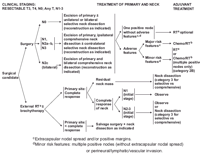 This can be treated with surgery or radiation, ( NCI site or review here). NCCN guidelines for early , more advanced and very advanced and radiation guidelines. See neck nodes from lip cancer.
