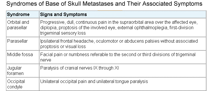 In the care of patients with cranial nerve palsy, several examinations of the CSF often are needed to determine whether tumor cells are present. Evaluation of the bones of the skull base with thin-section CT helps determine the presence of metastatic bone lesions. MRI of the brainstem is performed to evaluate for intraparenchymal lesions, although in most cases, other brainstem signs are present, in which case, this test should be part of the initial evaluation.