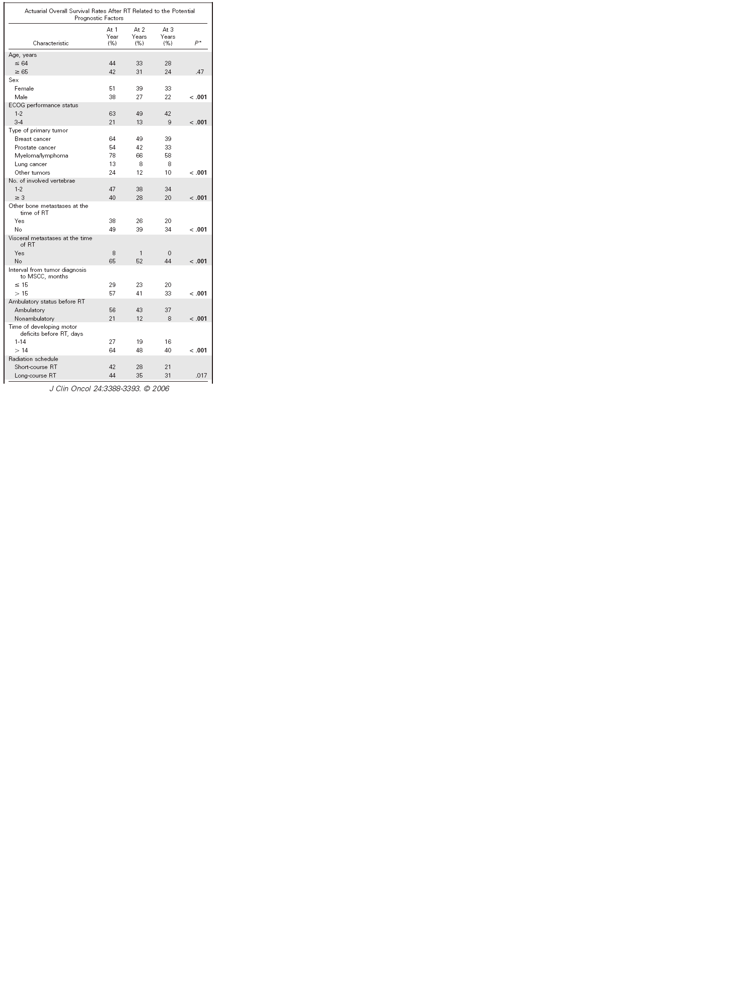 data, more data) - responders live longer (9.5 months versus 2 months) - ambulatory patients live longer than paralyzed (10 months versus 1 month) -favorable histologies (myeloma, breast, lymphoma) live longer than other types (12 months versus 4 months) see articles below: The management of metastatic spinal cord compression: a radiotherapeutic success ceiling.Leviov M, Dale J, S Int J Radiat Oncol Biol Phys 1993 Sep 30;27(2):231-4Department of Oncology, Rambam Medical Center, Faculty of Medicine, Technion-Israel Institute of Technology, Haifa. PURPOSE: In assessing the effectiveness of the management of metastatic spinal cord or cauda equina compression, we performed a retrospective analysis of 70 patients with this complication whom we treated from 1985 to 1989. METHODS AND MATERIALS: The most frequent primary diagnoses in our series were carcinomas of unknown origin and of the breast, lymphoproliferative disease, lung cancer, and prostatic carcinoma. We used the Findlay classification to group all patients according to their pre-therapeutic functional motor status as Grade I (24 patients or 34%), Grade II (27, or 39%) or Grade III (19 or 27%). Treatment consisted of 30-45 Gy of irradiation (using two different schedules) together with high-dose dexamethasone; in only five cases was there surgical intervention. RESULTS: We found that a powerful predictor of response to radiotherapy was the patient's neurologic status (Findlay grade) at the time of diagnosis: 66% of previously ambulatory patients remained so, whereas 30% of non-ambulatory patients and only 16% of paraplegic patients regained the ability to walk. Another important predictor of response was primary tumor histology, with the most favorable responses to radiation therapy having been observed in lymphoproliferative diseases and in breast cancer, but with some response in other radiosensitive malignancies as well. CONCLUSION: The similarity of our results to those of other centers leads us to conclude that a radiotherapeutic success ceiling of 80% may have been reached for Findlay Grade I patients with metastatic spinal cord compression. In view of this, we suggest that future therapeutic endeavour would be best directed toward early diagnosis of the condition. Metastatic spinal cord compression. Occurrence, symptoms, clinical presentations and prognosis in 398 patients with spinal cord compression.Bach F, Acta Neurochir (Wien) 1990;107(1-2):37-43Department of Oncology, University Hospital Herlev, Denmark. We reviewed all medical records concerning patients suffering from spinal cord or cauda equina compression (SCC) secondary to cancer, in the eastern part of Denmark, from 1979 through 1985. During the period the incidence of SCC in cancer patients went up from 4.4% to 6%. However, this increase was not significant. The series comprised 398 cases, with carcinoma of the prostate (19%), lung (18%), breast (14%) and kidney (10%) accounting for 61%. The symptoms were evaluated in accordance with the patients rating of pain, motor deficits, sphincter control and paraesthesia, whereas the clinical manifestations were classified on the basis of motor deficit and bladder dysfunction. During the period preceding the diagnosis of SCC, 83% of the patients suffered from back pain, 67% from deteriorating gait and 48% had retention of the urine. In 35% of the patients there was no sphincter disturbance and 10% had normal sensory function. The outcome of treatment was estimated by changes in motor deficits and sphincter function, and depended primarily on the patients condition at the time of the diagnosis. Of the patients who were able to walk before treatment, 79% remained ambulatory, whereas only 18% of the non-ambulatory patients regained walking ability. Patients treated by decompressive laminectomy followed by radiotherapy apparently had a better response than patients treated with surgery or irradiation alone, but when the patients pre-treatment motor function was taken into account, no significant difference was observed. The study may call for a properly randomized trial with careful stratification of tumour biology, performance status and neurological deficits. Epidural spinal cord compression from metastatic tumor: results with a new treatment protocol.Greenberg HS, Kim JH, Posner JB. Ann Neurol 1980 Oct;8(4):361-6 Eighty-three patients with epidural spinal cord compression, from metastatic cancer were treated with high-dose adrenocorticosteroids and a new radiation fractionation protocol. Only those patients were included who had complete or almost complete block on myelography and who had not received prior radiation therapy to the area of compression. Patients were given 100 mg of dexamethasone intravenously at the time of diagnosis and 500 rads of radiation on each of the first three days. After a four-day rest, radiation therapy was continued at 300 rads to a total dose of 3,000 rads. The effects of this new protocol on the patient's motor abilities did not differ from those of previous protocols, namely, 47 of 83 patients (57%) were ambulatory after treatment, with no responses in patients totally paraplegic before treatment. However, early administration of high doses of dexamethasone substantially ameliorated pain in the majority of patients, with relief often coming within hours after the drug was given. On the basis of these data, we recommend high doses of adrenocorticosteroids combined with radiation therapy for acute treatment of spinal cord compression. The optimum fractionation schedule for radiation therapy is not established. Radiotherapeutic management of spinal metastases.Janjan NA J Pain Symptom Manage 1996 Jan;11(1):47-56 Department of Radiotherapy, University of Texas, Houston, USA. Radiotherapy remains the primary treatment of malignant epidural spinal cord compression. Therapeutic success depends on diagnosis before the development of neurological compromise and the prompt initiation of radiotherapy. Rad