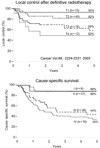 Definitive radiotherapy alone or combined with a planned neck dissection for squamous cell carcinoma of the pharyngeal wall William M. Mendenhall, Department of Radiation Oncology, University of Florida Health Science Center, see outcome graphs Between 1964 and 2000, 148 patients were treated with definitive radiotherapy. All patients had a 2-year minimum follow-up. The following 5-year rates of local and ultimate local control were obtained: T1 disease, 93% and 93%; T2 disease, 82% and 87%; T3 disease, 59% and 61%; and T4 disease, 50% and 50%, respectively. Multivariate analysis revealed that twice-daily fractionation (P = 0.0009), American Joint Committee on Cancer Stage I-II disease (P = 0.0051), and oropharyngeal primary site (P = 0.0193) were associated with improved locoregional control. The following 5-year absolute and cause-specific survival rates were obtained: Stage I, 56% and 89%; Stage II, 52% and 88%; Stage III, 24% and 44%; Stage IV, 22% and 34%; and overall, 30% and 49%, respectively. Eight patients (5%) died of complications. Our current approach is to employ altered fractionation using hyperfractionation for patients undergoing three-dimensional conformal radiotherapy. Patients receive 74.4-76.8 Gy at 1.2 Gy per fraction twice daily with a minimum 6-hour interfraction interval. Patients who undergo intensity-modulated radiotherapy receive 72 Gy in 42 fractions over 6 weeks using the M. D. Anderson Cancer Center concomitant-boost technique. Patients with T3-T4 and/or bulky N2/N3 disease receive concomitant weekly cisplatin or weekly carboplatin and paclitaxel. Patients with clinically positive neck lymph nodes undergo a CT scan 4 weeks after chemoradiation and a neck dissection is performed if the likelihood of residual neck disease is believed to be greater than 5%. Patients receive aggressive swallowing therapy during and after chemoradiation to reduce the risk of long-term gastrostomy tube dependence. Cancer 2003;98:2224.