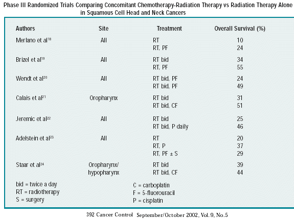 Two (1.6%) patients died from therapy-related complications. CONCLUSIONS: Concomitant weekly cisplatin with altered fractionation RT is a safe and effective treatment regimen. Cancer 2010. © 2010 American Cancer Society. Lancet 2000 Mar 18;355(9208):949-55 Chemotherapy added to locoregional treatment for head and neck squamous-cell carcinoma: three meta-analyses of updated individual data. MACH-NC Collaborative Group. Meta-Analysis of Chemotherapy on Head and Neck Cancer.Pignon JP, Bourhis J, Domenge C, Designe LDepartment of Biostatistics and Epidemiology, Institut Gustav-Roussy, Villejuif, France. jppignon@igr.fr BWe updated data on all patients in randomised trials between 1965 and 1993. We included patients with carcinoma of the oropharynx, oral cavity, larynx, or hypopharynx. The main meta-analysis of 63 trials (10,741 patients) of locoregional treatment with or without chemotherapy yielded a pooled hazard ratio of death of 0.90 corresponding to an absolute survival benefit of 4% at 2 and 5 years in favour of chemotherapy. There was no significant benefit associated with adjuvant or neoadjuvant chemotherapy. Chemotherapy given concomitantly to radiotherapy gave significant benefits, but heterogeneity of the results prohibits firm conclusions. Meta-analysis of six trials (861 patients) comparing neoadjuvant chemotherapy plus radiotherapy with concomitant or alternating radiochemotherapy yielded a hazard ratio of 0.91 (0.79-1.06) in favour of concomitant or alternating radiochemotherapy. Three larynx-preservation trials (602 patients) compared radical surgery plus radiotherapy with neoadjuvant chemotherapy plus radiotherapy in responders or radical surgery and radiotherapy in non-responders. The hazard ratio of death in the chemotherapy arm as compared with the control arm was 1.19 (0.97-1.46). INTERPRETATION: Because the main meta-analysis showed only a small significant survival benefit in favour of chemotherapy, the routine use of chemotherapy is debatable. For larynx preservation, the non-significant negative effect of chemotherapy in the organ-preservation strategy indicates that this procedure must remain investigational. Cancer 2000 Feb 15;88(4):876-83 Mature results of a phase III randomized trial comparing concurrent chemoradiotherapy with radiation therapy alone in patients with stage III and IV squamous cell carcinoma of the head and neck. Adelstein DJ, The Cleveland Clinic Foundation,The current study presents mature results from a Phase III randomized trial comparing radiation therapy and concurrent chemoradiotherapy in patients with resectable American Joint Committee on Cancer Stage III and IV disease. METHODS: One hundred patients were randomized to receive either radiation therapy alone (Arm A) (at a dose of between 66-72 grays [Gy] at 1.8-2 Gy per day) and the identical radiation therapy with concurrent chemotherapy (Arm B) (5-fluorouracil, 1000 mg/m(2)/day, and cisplatin, 20 mg/m(2)/day, both given as continuous intravenous infusions over 4 days beginning on Days 1 and 22 of the radiation therapy). Primary site resection was planned for patients with residual or recurrent local disease. Cervical lymph node dissection was performed for regional persistent disease or recurrence, or if N2-3 disease was present at the time of presentation. RESULTS: After completing all therapy including surgery, 82% of the patients in Arm A and 98% of the patients in Arm B had been rendered disease free.. At a median follow-up of 5 years (range, 3-8 years), the 5-year Kaplan-Meier projections for overall survival for Arm A versus Arm B were 48% versus 50% (P = 0.55). Kaplan-Meier projections for the recurrence free interval were 51% versus 62% (P = 0.04), projections for a distant metastasis free interval were 75% versus 84% (P = 0. 09), projections for overall survival with primary site preservation were 34% versus 42% (P = 0.004), and projections for local control without surgical resection were 45% versus 77% (P < 0.001). Salvage surgery proved to be successful in 63% and 73%, respectively, of the Arm A and Arm B patients with primary site failure. Unrelated death while free of disease occurred in 22% and 32%, respectively, of Arm A and Arm B patients (P = 0.26). CONCLUSIONS: The addition of concurrent chemotherapy to definitive radiation in patients with resectable Stage III and IV squamous cell carcinoma of the head and neck improves the likelihood of disease clearance, a recurrence free interval, and primary site preservation. However, overall survival does not appear to be improved, reflecting both effective surgical salvage after local recurrence and competing causes of death. N Engl J Med 1998 Jun 18;338(25):1798-804 Hyperfractionated irradiation with or without concurrent chemotherapy for locally advanced head and neck cancer.Brizel. Patients with advanced head and neck cancer who were treated only with hyperfractionated irradiation received 125 cGy twice daily, for a total of 7500 cGy. Patients in the combined-treatment group received 125 cGy twice daily, for a total of 7000 cGy, and five days of treatment with 12 mg of cisplatin per square meter of body-surface area per day and 600 mg of fluorouracil per square meter per day during weeks 1 and 6 of irradiation. Two cycles of cisplatin and fluorouracil were given to most patients after the completion of radiotherapy. At three years the rate of overall survival was 55 percent in the combined-therapy group and 34 percent in the hyperfractionation group. The relapse-free survival rate was higher in the combined-treatment group (61 percent vs. 41 percent. The rate of locoregional control of disease at three years was 70 percent in the combined-treatment group and 44 percent in the hyperfractionation group. Int J Radiat Oncol Biol Phys 2000 Apr 1;47(1):49-56 The use of carboplatin and paclitaxel with daily radiotherapy in patients with locally advanced squamous cell carcinomas of the head and neck.Suntharalingam M, Haas ML, Conle