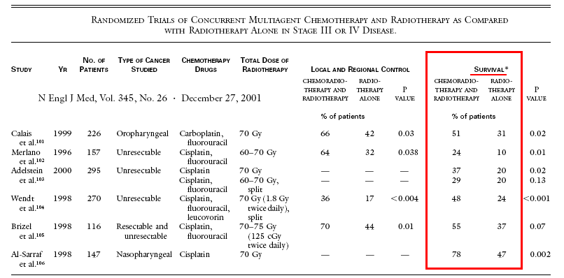 A recent comparison of the RTOG head and neck trails for advanced throat cancer showed better survivals (50 -63% .3y) with planned chemoradiation over just radiation alone (34 - 38%/3y) as noted below from the RTOG 97-03 trial |