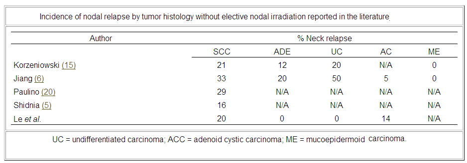 We reviewed the records of 97 patients treated for maxillary sinus carcinoma with radiotherapy at Stanford University and at the University of California, San Francisco between 1959 and 1996. Fifty-eight patients had squamous cell carcinoma (SCC), 4 had adenocarcinoma (ADE), 16 had undifferentiated carcinoma (UC), and 19 had adenoid cystic carcinoma (AC). Thirty-six patients had neck irradiation, 25 of whom received elective neck irradiation (ENI) for N0 necks.The median survival for all patients was 22 months (range: 2.4–356 months). The 5- and 10-year actuarial survivals were 34% and 31%, respectively. Ten patients relapsed in the neck, with a 5-year actuarial risk of nodal relapse of 12%. The 5-year risk of neck relapse was 14% for SCC, 25% for ADE, and 7% for both UC and ACC. The overall risk of nodal involvement at either diagnosis or on follow-up was 28% for SCC, 25% for ADE, 12% for UC, and 10% for AC. All patients with nodal involvement had T3–4, and none had T2 tumors. ENI effectively prevented nodal relapse in patients with SCC and N0 neck; the 5-year actuarial risk of nodal relapse was 20% for patients without ENI and 0% for those with elective neck therapy. There was no correlation between neck relapse and primary tumor control or tumor extension into areas containing a rich lymphatic network. The most common sites of nodal relapse were in the ipsilateral level 1–2 nodal regions (11/13). The 5-year actuarial risk of distant relapse was 29% for patients with neck control versus 81% for patients with neck failure. There was also a trend for decreased survival with nodal relapse. The 5-year actuarial survival was 37% for patients with neck control and 0% for patients with neck relapse. Conclusion: The overall incidence of lymph node involvement at diagnosis in patients with maxillary sinus carcinoma was 9%. Following treatment, the 5-year risk of nodal relapse was 12%. SCC histology was associated with a high incidence of initial nodal involvement and nodal relapse. None of the patients presenting with SCC histology and N0 necks had nodal relapse after elective neck irradiation. Patients who had nodal relapse had a higher risk of distant metastasis and poorer survival. Therefore, our present policy is to consider elective neck irradiation in patients with T3–4 SCC of the maxillary sinus. Carcinomas of the maxillary sinus are uncommon, with an annual incidence of < 1:100,000 in the United States. They comprise 0.2–0.5% of all cancers, 3% of all head and neck cancers, and 80% of all paranasal sinus cancers. In general, they represent a challenging therapeutic dilemma because of their rarity and proximity to critical structures. The incidence of primary nodal metastasis at presentation ranges from 3.3% to 26% Because of the general belief that nodal metastasis is uncommon in tumors without extensive lymphatic involvement, most authors have advocated no elective neck irradiation (ENI) for patients with maxillary sinus carcinoma. This long-held conviction has been recently challenged by Jiang and Paulino. Both authors advocated elective ipsilateral neck irradiation in patients with squamous cell carcinoma (SCC) due to the high incidence of neck relapse associated with this histology (28.9–33%) and the inferior survival of those who relapsed in the neck. At Stanford University (SUH) and at the University of California, San Francisco (UCSF), there has not been a uniform policy on the use of ENI for maxillary sinus carcinoma. The technique and the extent of neck irradiation has also varied depending on the treating physician and the period of treatment. To determine the incidence and the pattern of nodal relapse, its influence on the overall tumor control and survival, and the effectiveness of ENI in preventing nodal metastasis, we undertook a retrospective review of the patients treated definitively for maxillary sinus carcinoma at both institutions. Carcinoma of the maxillary sinus is a rare condition in the United States. Because of the tumor location and the lack of early symptoms, patients usually present with advanced disease, resulting in poor local control and survival. In recent years, with the use of combined modality therapy employing modern surgical and radiotherapeutic approaches and chemotherapy, investigators have noted an improvement in treatment results. With better local control, more attention is being paid to regional and distant metastases. Recently, some studies have demonstrated an association between tumor histology and the incidence of nodal relapse. Many have also shown poorer survival or disease-specific survival with regional failure. The issue of ENI for these tumors has been controversial. Fletcher, in their textbook, recommended ENI for patients with T3–4 tumors, a view supported by Bataini and Ennuyer. In contrast, others do not advocate ENI due to the low incidence of nodal failure, poor local control, and low survival rates in these patients. Recently, Jiang revisited the issue, and recommended ENI for patients with SCC and UC histologies based on a > 30% incidence of neck relapse in N0 patients when the neck is not treated. summary of the incidence of nodal relapse by tumor histology reported in the literature for maxillary sinus carcinoma when no ENI was given. In patients treated without ENI, Jiang reported a 33% risk of neck relapse for SCC, 50% for UC, and 5% for both AC and mucoepidermoid histologies. Patients with regional failure had an inferior 10-year disease-specific survival rate compared to those without (34% vs. 58%). Based on these findings, the authors advocated elective nodal treatment for patients with T2–4 squamous cell or UC. Korzeniowski noted a similar influence of histology on regional control. In their report, the frequency of nodal metastasis at presentation and during follow-up was 60% in patients with UC, 30% in patients with nonkeratinizing SCC, and 13% for patients with keratinizing SCC. They recommended ENI 